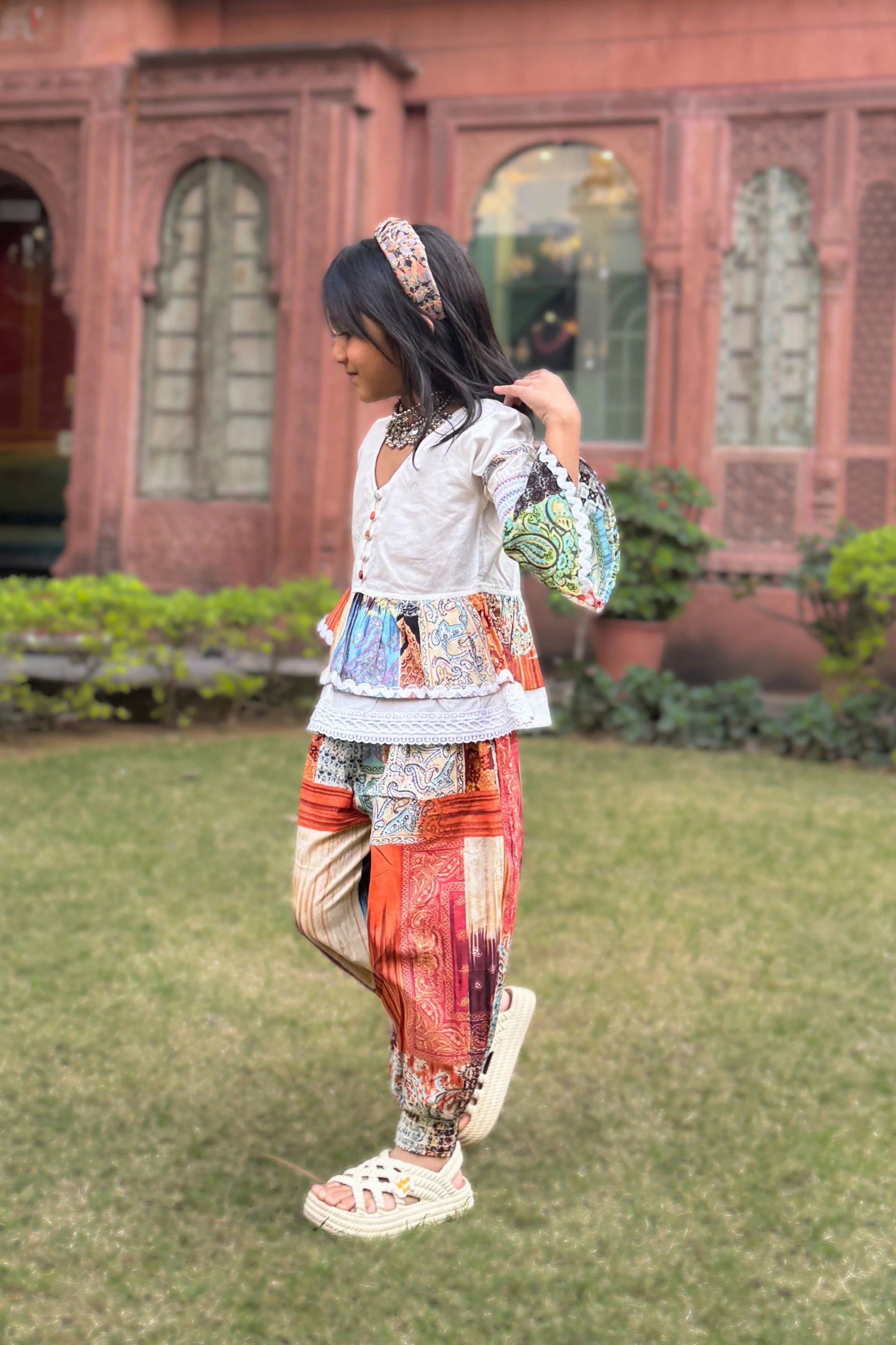 Chic in White: Peekaaboo Full Sleeve V-Neck Top & Lace Harem Pant Set for Little Party Stars