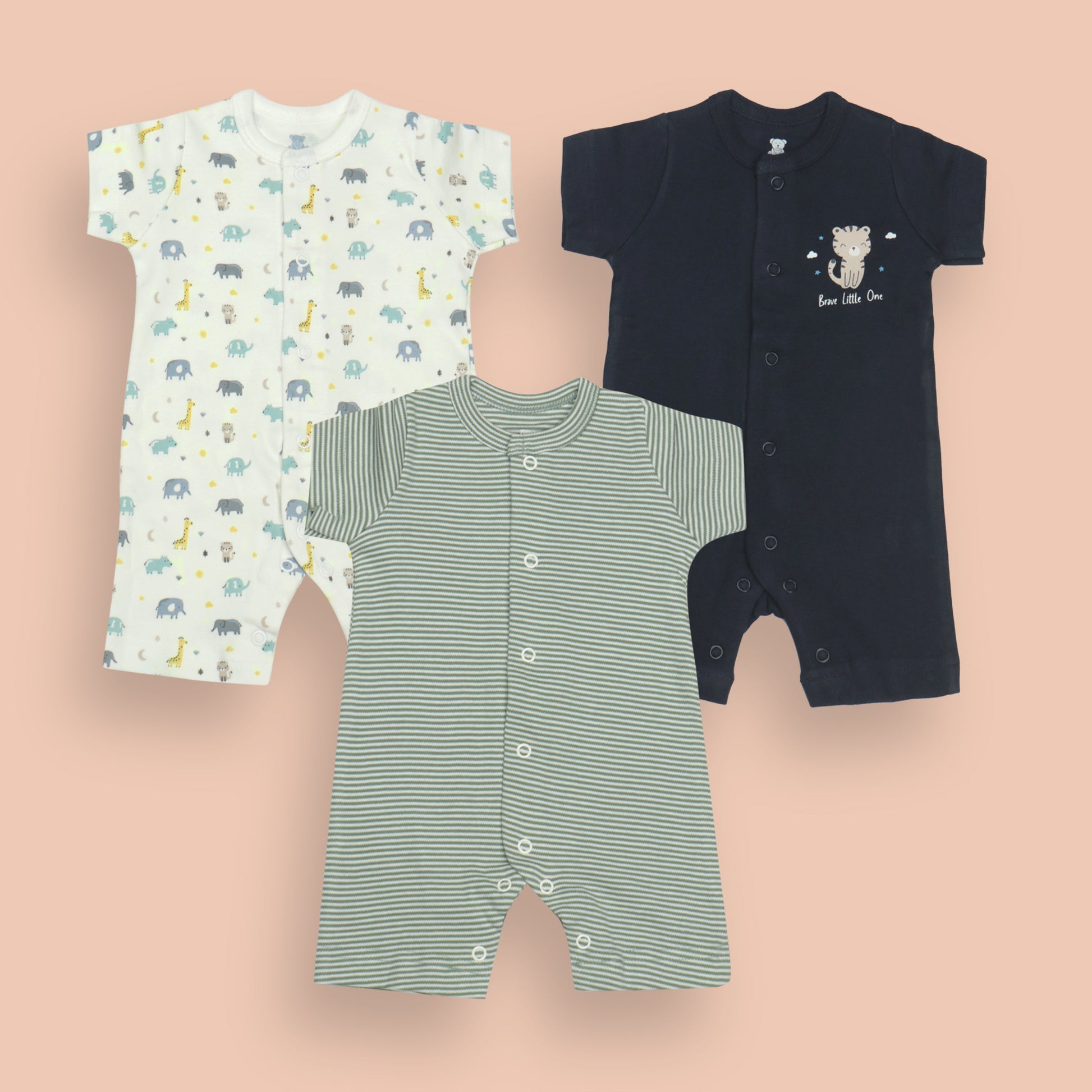 Pack of 3 Adorable Baby Rompers – Navy Blue “Brave Little One” Cat Print, Striped Green with Easy Snap Buttons, Off White Animal Print