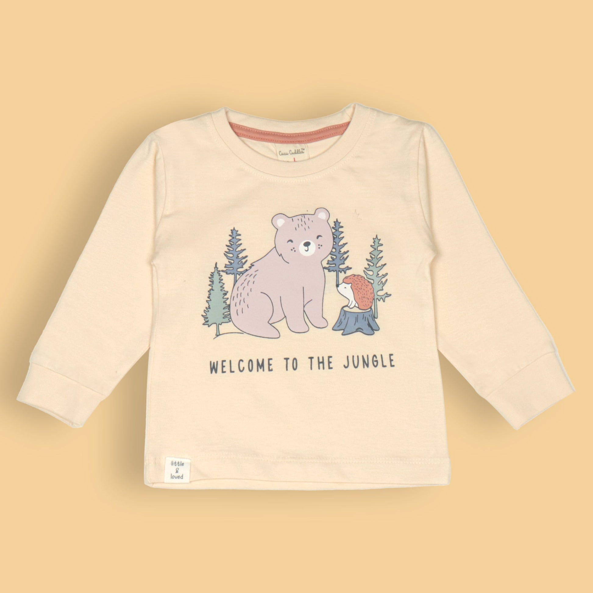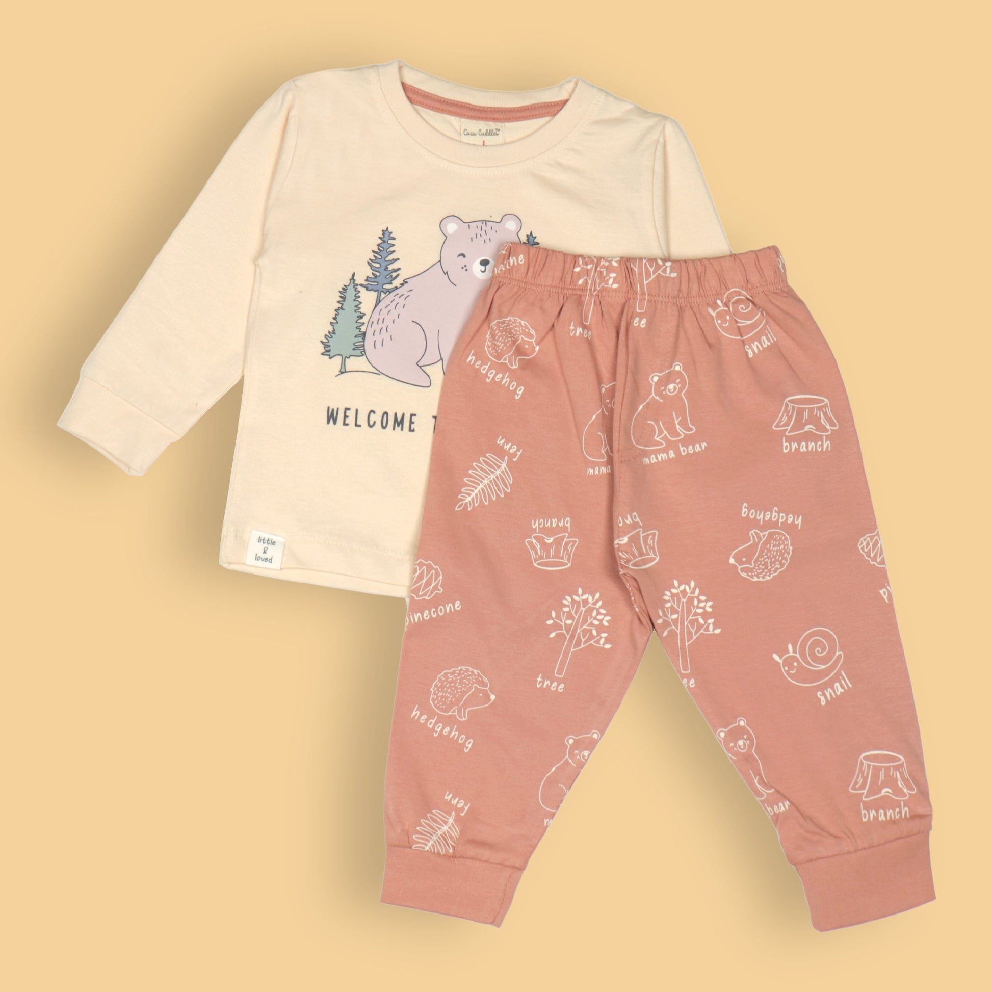 Welcome to the Jungle Set by Cucumber – Cream Full Sleeve Tee & Coral Jogger Pants, Soft Cotton Playwear