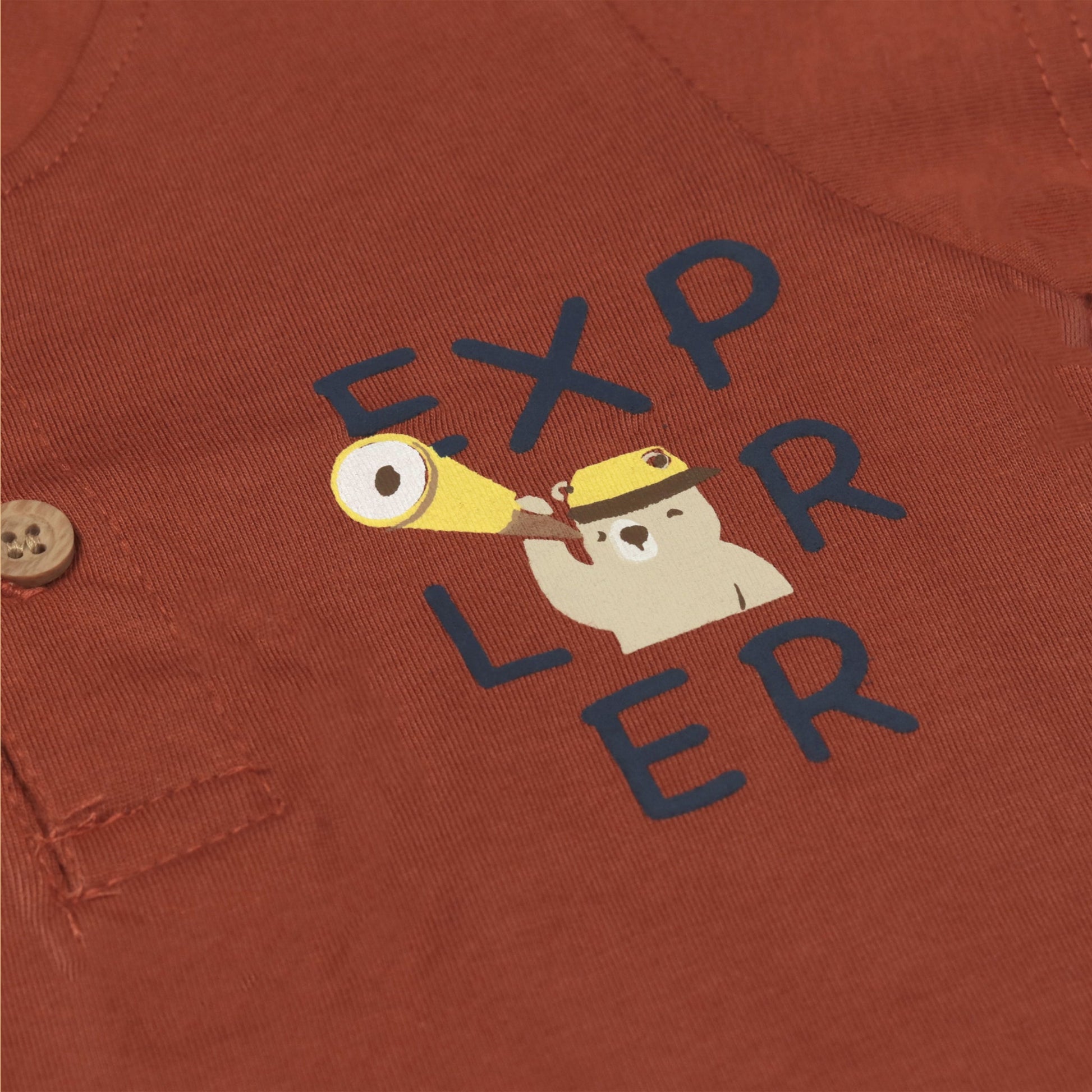 Zero Boys’ Summer Essentials Set – Dark Orange Half Sleeve Teddy Bear Cartoon Tee with Front Button & Elastic Waist Shorts