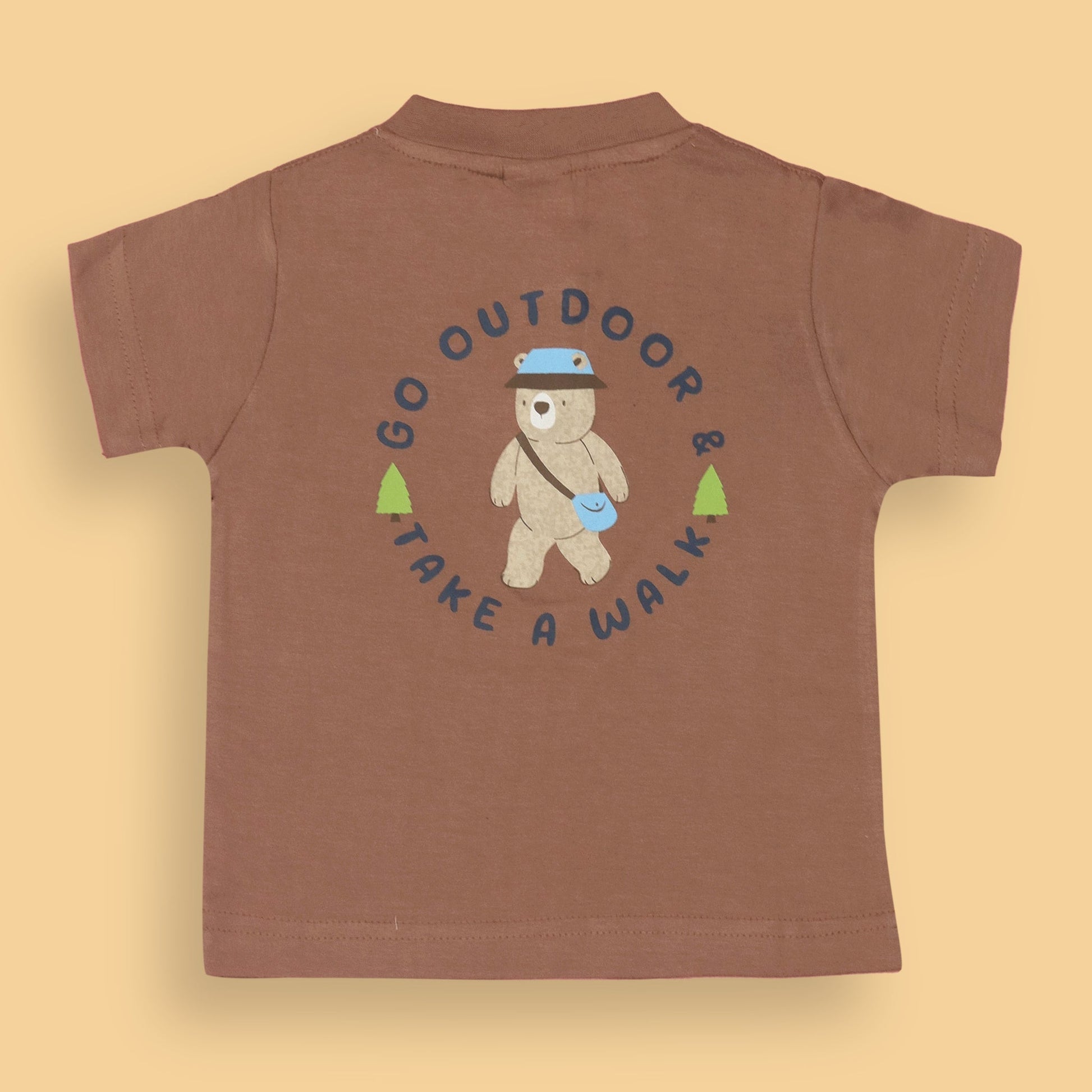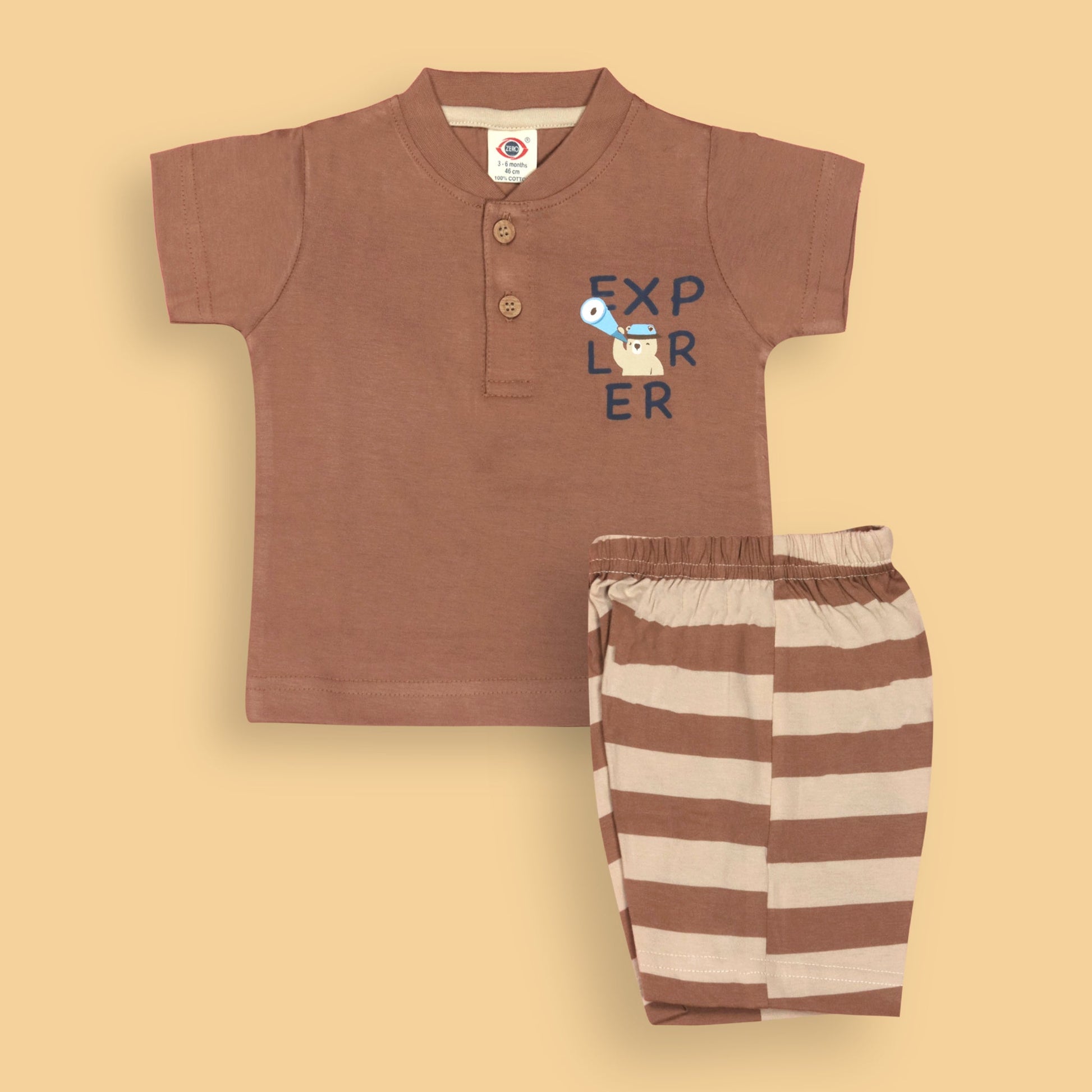 Zero Boys’ Summer Essentials Set – Camel Color Half Sleeve Teddy Bear Cartoon Tee with Front Button & Elastic Waist Shorts