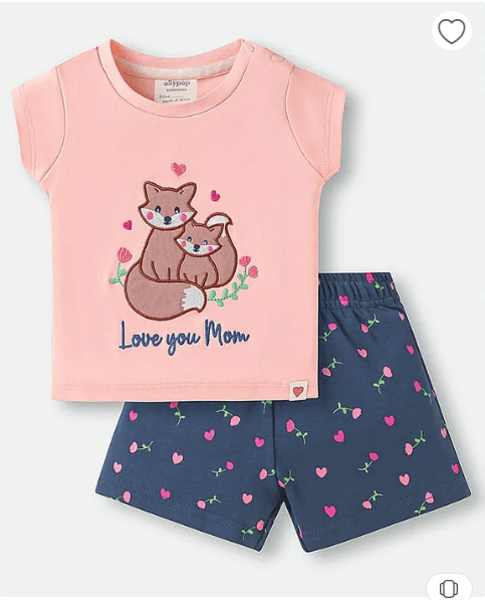 Ollypop Sinker Knit Half Sleeves T-Shirt & Shorts Set with Kitty Embroidery & Print - Navy Blue & Pink